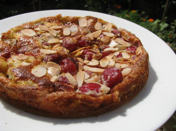 This French pastry-less tart (actually more like a puffy, fruit-studded thick pancake) is traditionally made with unstoned cherries, but you can stone them if you like, or substitute plums or other fruits.
